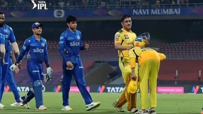 मुंबई इंडियंस के खिलाफ मैच के बाद चेन्नई के मौजूदा कप्तान रवींद्र जडेजा पूर्व कप्तान धोनी के सामने नतमस्तक हो गए। इस मैच में 155 रन का पीछा करते हुए धोनी पुरानी लय में नजर आए और 13 गेंद में 28 रन की पारी खेली। उन्होंने मैच की आखिरी गेंद में चौका लगाकर अपनी टीम को जीत दिलाई। इसके बाद जडेजा ने झुककर धोनी को सलाम किया और उनकी तूफानी पारी की तारीफ की। 40 साल के धोनी इस मैच में पुरानी लय में दिखे और आखिरी चार गेंदों में 16 रन बनाए। इन चार गेंदों में गेंदबाज ने यॉर्कर से लेकर बाउंसर तक हर तरह की गेंद आजमा ली थी, लेकिन धोनी से पार नहीं पा सके।
