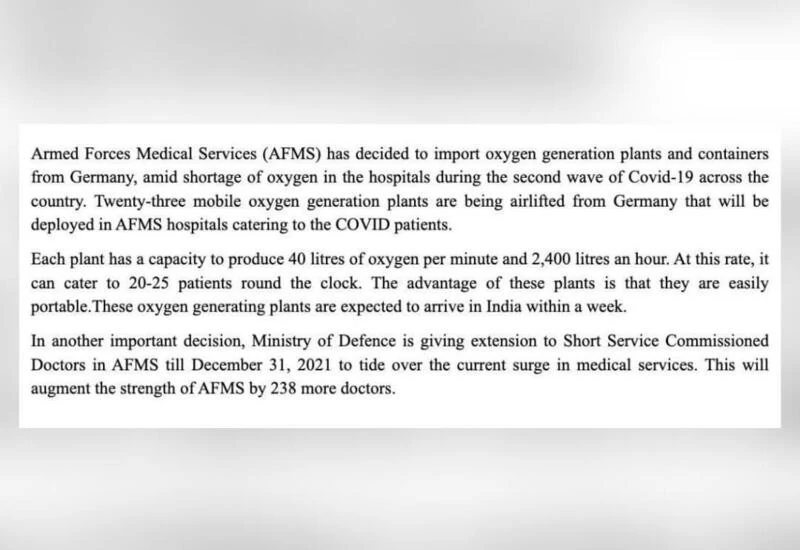 बाबू ने कहा, ‘‘ 23 सचल आक्सीजन उत्पादन संयंत्र को हवाई मार्ग से जर्मनी से लाया जायेगा . इन्हें कोविड-19 के मरीजों का उपचार करने वाले एएफएमसी के अस्पतालों में स्थापित किया जाएगा. ’’