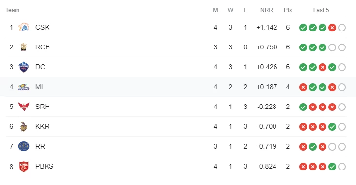 प्वॉइंट टेबल में तीसरे नंबर पर दिल्ली कैपिटल्स है। वहीं मुंबई इंडियंस की बात करें तो वो चौथे नंबर पर है। पांचवे नंबर पर सनराइजर्स हैदराबाद है। पंजाब किंग्स को हराकर बुधवार को उसने आईपीएल 2021 में अपनी पहली जीत दर्ज की। केकेआर को सीएसके के खिलाफ मैच में हार का खामियाजा भुगतना पड़ा है और वो छठे नंबर पर खिसक गई है। इससे पहले वो पांचवे नंबर पर थी। सातवें नंबर पर राजस्थान रॉयल्स की टीम है। केएल राहुल की अगुवाई वाली पंजाब किंग्स की बात करें तो वो आखिरी पायदान पर पहुंच चुकी है।