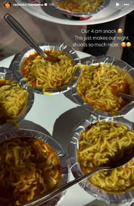 रश्मिका ने हाल ही में सोशल मीडिया पर अपने प्रशंसकों के साथ एक अनोखी झलक साझा की, जिसमें उन्होंने अपने नाइट शूट के बाद का स्नैक दिखाया। इंस्टाग्राम स्टोरीज पर उन्होंने दोने में भरे इंस्टेंट नूडल्स की तस्वीर पोस्ट की और कैप्शन में लिखा – "हमारा 4 बजे का स्नैक! यह हमारी नाइट शूट को और भी बेहतर बनाता है।" यह पोस्ट उनके प्रशंसकों के बीच काफी वायरल हो रही है और उनके कठिन परिश्रम की झलक देती है।