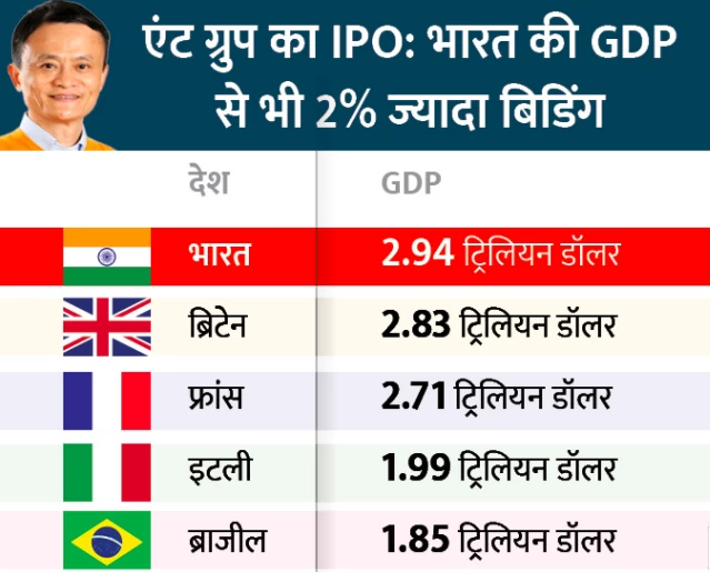 चीन के सबसे अमीर कारोबारी जैक मा के अलीबाबा ग्रुप की फाइनेंशियल सर्विसेज कंपनी एंट ग्रुप, इस हफ्ते दुनिया का सबसे बड़ा IPO लाई। कंपनी ने 35 अरब डॉलर के शेयर जारी किए थे, लेकिन सब्सक्रिप्शन के आखिरी दिन शुक्रवार तक कंपनी को 3 ट्रिलियन डॉलर यानी 222 लाख करोड़ रुपए की बिड्स मिलीं। यह रकम (3 ट्रिलियन डॉलर) दुनिया की पांचवीं बड़ी इकोनॉमी वाले देश भारत की GDP (2.94 ट्रिलियन डॉलर) से भी 2% ज्यादा है।