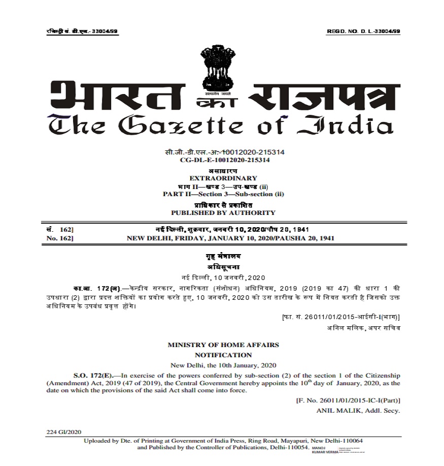 नई दिल्ली। नागरिकता (संशोधन) अधिनियम (Citizenship (Amendment) Act) शुक्रवार से देश भर में लागू हो गया है। केंद्र सरकार ने इसे लेकर नोटिफिकेशन भी जारी कर दिया है। गृह मंत्रालय (Home Ministry) की ओर से यह अधिसूचना जारी की गई है, जिसमें 10 जनवरी 2020 से इस अधिनियम (कानून) को लागू करने की घोषणा की गई है।गृह मंत्रालय की ओर से जारी अधिसूचना में लिखा है, 'केंद्रीय सरकार, नागरिकता (संशोधन) अधिनियम, 2019 (2019 का 47) की धारा 1 की उपधारा (2) द्वारा प्रदत शक्तियों का प्रयोग करते हुए, 10 जनवरी 2020 को उस तारीख के रूप में नियत करती है जिसको उक्त अधिनियम के उपबंध प्रवृत होंगे।'