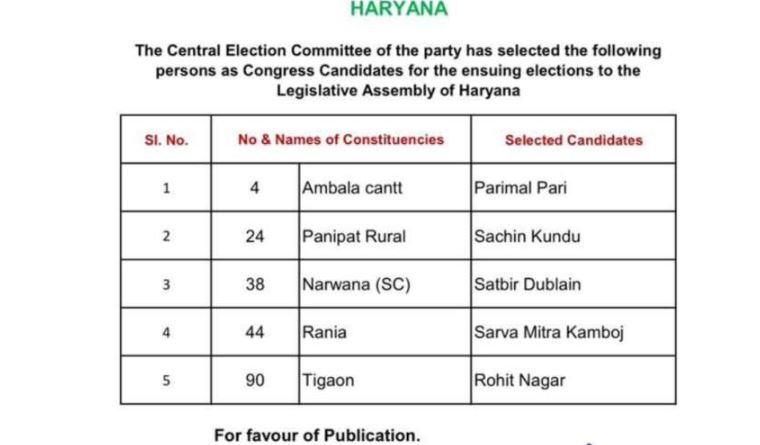 अब तक 86 नामों की घोषणाकांग्रेस ने अब तक हरियाणा विधानसभा की 90 सीटों में से 86 पर उम्मीदवारों के नामों की घोषणा कर दी है। पार्टी ने अपनी पहली सूची में 32 और दूसरी सूची में 9 उम्मीदवारों का नाम जारी किया था। अभी भी 4 सीटों के उम्मीदवारों की घोषणा बाकी है। नामांकन की आखिरी तारीख 12 सितंबर है, और चुनावी वोटिंग 5 अक्टूबर को होगी, जबकि चुनाव परिणाम 8 अक्टूबर को घोषित किए जाएंगे।कांग्रेस की इस तैयारी और उम्मीदवारों की सूची से यह साफ हो रहा है कि पार्टी चुनावी मैदान में अपनी पूरी ताकत झोंकने के लिए तैयार है। आगामी चुनावों में यह देखना दिलचस्प होगा कि कांग्रेस की इस रणनीति और उम्मीदवारों की सूची से पार्टी को कितना लाभ होता है और यह हरियाणा की राजनीति में कितनी प्रभावी साबित होती है।
