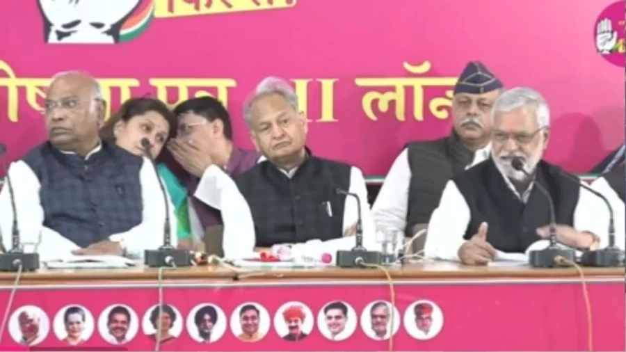 Rajasthan Elections: विधानसभा चुनावों की वोटिंग से चार दिन पहले कांग्रेस ने घोषणा पत्र जारी कर दिया है। कांग्रेस मुख्यालय में वरिष्ठ नेताओं के साथ राष्ट्रीय अध्यक्ष मल्लिकार्जुन खड़गे ने घोषणा पत्र जारी किया है। कांग्रेस के घोषणा पत्र में सात गारंटियों की तरह ही कई लोकलुभावन घोषणाओं काे शामिल किया है। किसानों से न्यूनतम समर्थन मूल्य (MSP) पर फसल खरीद का कानून बनाने और किसानों को 2 लाख रुपए तक का ब्याज मुक्त कर्ज देने का वादा किया है।