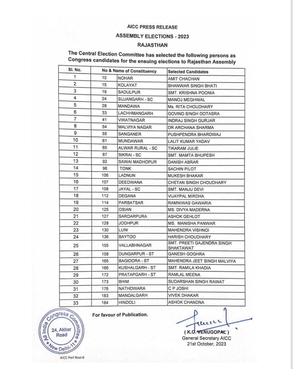 Rajasthan Election: राजस्थान विधानसभा चुनाव के लिए कांग्रेस पार्टी ने उम्मीदवारों की पहली लिस्ट जारी कर दी है. इस लिस्ट में 33 उम्मीदवारों के नाम हैं. पार्टी ने सचिन पायलट को टोंक विधानसभा सीट से टिकट दिया है. मुख्यमंत्री अशोक गहलोत अपनी पुरानी सीट सरदारपुरा से ही चुनाव लड़ेंगे. कांग्रेस की लिस्ट में पांच मंत्रियों को जगह मिली है. पार्टी ने दो विधायकों के टिकट काटे हैं. चितौड़ से चंद्रभान सिंह और सांगानेर से अशोक लाहौटी की टिकट काटी गई है. संतोष अहलावत को सूरजगढ़ से टिकट दिया गया है. 2013 में सूरजगढ़ से ही विधानसभा जीती थीं. इनकी लोकसभा टिकट 2019 चुनाव में काट दी गई थी जबकि झुंझुनूं से 2014 में सांसद बनी थीं.कौन कहां से लड़ रहा चुनाव?गोविंद सिंह डोटासरा लाछमनगढ़ और मुकेश भाकर लाडनूं से चुनाव लड़ेंगे. बायतू से हरीश चौधरी, मालवीय नगर से अर्चना शर्मा और नाथद्वारा से सीपी जोशी को टिकट दिया गया है. ओसियां से दिव्या मदेरणा को टिकट मिला है. इनके अलावा पार्टी की लिस्ट में तीन नेताओं शांति धारीवाल, महेश जोशी और धर्मेंद्र राठौड़ का नाम नहीं है. पार्टी ने इन्हें नोटिस जारी किया है और इन नेताओं से संबंधित सीटों पर अभी कैंडिडेट का ऐलान नहीं हुआ है.