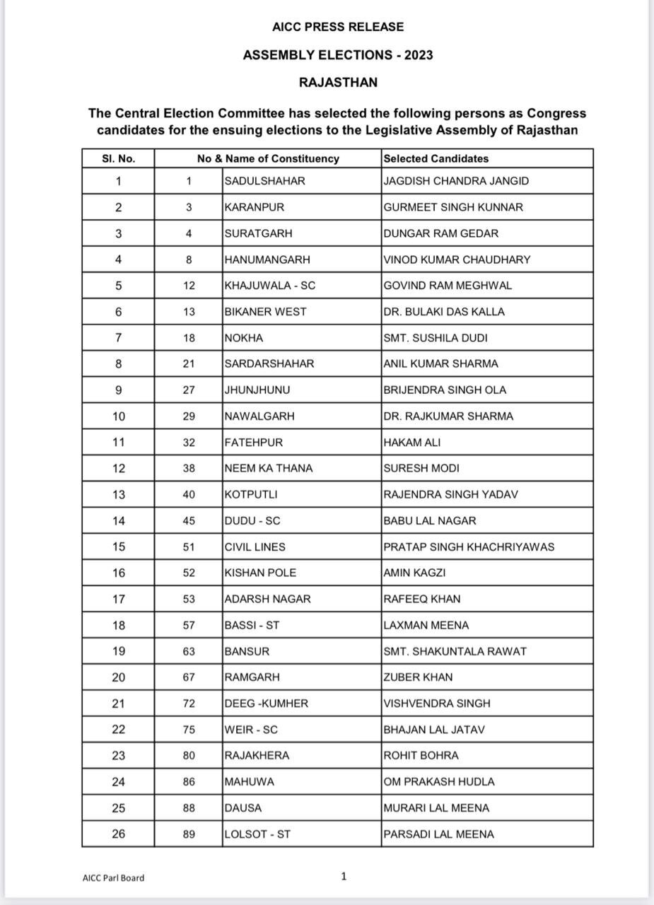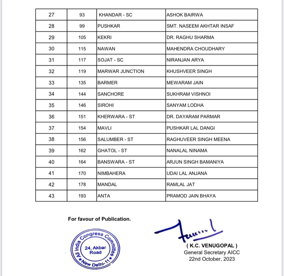 क्या खास है इस लिस्ट में?इस लिस्ट में 15 मंत्रियों के नाम हैं, जिसमें एक पूर्व मुख्य सचिव भी शामिल हैं। शांति धारिवाल, महेश जोशी और धर्मेंद्र राठौड़ का नाम इस लिस्ट में भी नहीं है। हालांकि दोनों लिस्ट में इनकी सीटों पर प्रत्याशियों के नाम भी जारी नहीं हुए हैं।रामगढ़ सीट पर कांग्रेस ने साफिया जुबेर खान की जगह जुबेर खान को टिकट दिया है। जुबेर खान साफिया के पति हैं और आईसीसी सेक्रेटरी भी हैं। नोखा से रामेश्वर डूडी की पत्नी सुशीला डूडी को टिकट दिया गया है। रामेश्वर डूडी हाल में ब्रेन हेमरेज़ के चलते अस्पताल में भर्ती हुए थे। अभी उनकी कंडीशन सीरियस है।महुआ से ओम प्रकाश हुडला को टिकट दिया गया है। पिछली बार उन्होंने निर्दलीय चुनाव लड़ा था। सोजत से निरंजन आर्य को मौका दिया गया है। वह गहलोत सरकार में मुख्य सचिव थे और चुनाव लड़ने की तैयारी कर रहे थे। बाकी कांग्रेस ने इस लिस्ट में बहुत बदलाव नहीं किया है। एक-दो सीटों को छोड़कर सभी सीटों पर उम्मीदवारों को दोबारा मौका दिया गया है। राजस्थान चुनाव के लिए बनाई गई कॉडिनेशन कमेटी राजस्थान चुनाव के लिए कांग्रेस ने कॉडिनेशन कमेटी भी बनाई है। इसका चेयरमैन मोहन प्रकाश को बनाया गया है। लक्ष्मण सिंह रावत और नीरज डांगी को कन्वेनर बनाया गया है। वहीं रामसिंह कासवान को को-कन्वेनर बनाया गया है।