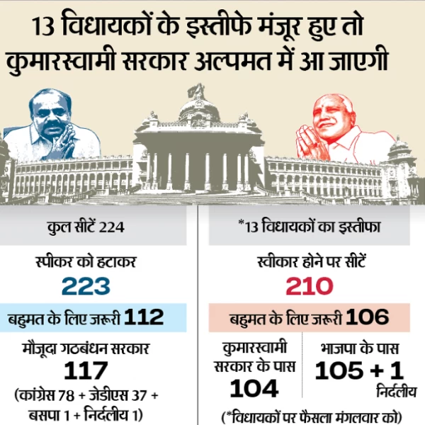 शनिवार को कांग्रेस-जेडीएस के 13 विधायकों ने स्पीकर को इस्तीफा दे दिया था। स्पीकर ने कहा था कि इस्तीफों पर मंगलवार को फैसला लेंगे। अगर 13 विधायकों के इस्तीफे स्वीकार होते हैं तो विधानसभा में कुल 211 सदस्य रह जाएंगे। विधानसभा अध्यक्ष को छोड़कर ये संख्या 210 रह जाएगी। ऐसे में बहुमत के लिए 106 विधायकों की जरूरत होगी। ऐसे में कुमारस्वामी सरकार अल्पमत में आ जाएगी।