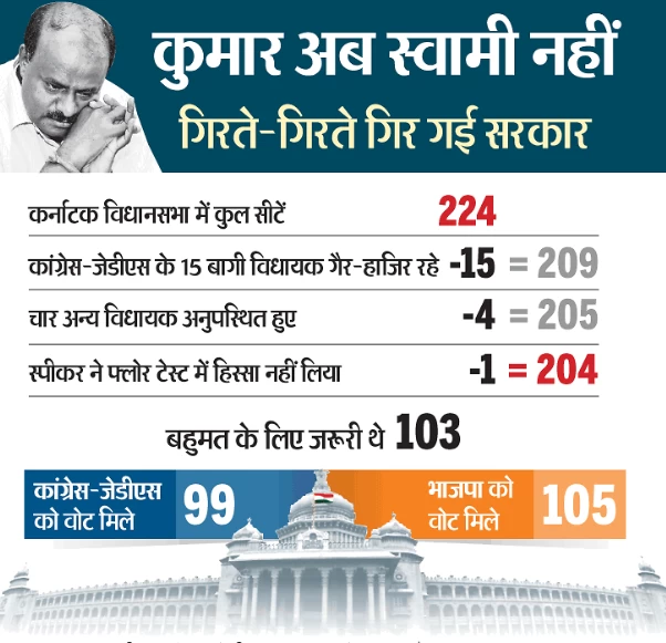 4 दिन चर्चा, तीन डेडलाइन बीतने के बाद फ्लोर टेस्ट: गुरुवार, शुक्रवार, सोमवार और मंगलवार को विश्वास मत पर चर्चा हुई। भाजपा ने सत्ता पक्ष पर आरोप लगाया कि वे लंबे-लंबे भाषण देकर फ्लोर टेस्ट को टालना चाहते हैं। राज्यपाल ने दो बार डेडलाइन दी लेकिन फ्लोर टेस्ट नहीं हो सका। इसके बाद स्पीकर ने भी मंगलवार शाम 6 बजे की डेडलाइन दी, तय समयसीमा के भीतर फ्लोर टेस्ट नहीं हुआ। हालांकि, इसके करीब 2 घंटे बाद कुमारस्वामी फ्लोर टेस्ट में फेल हो गए।
