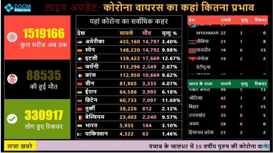जूम न्यूज आपको उपलब्ध करवा रहा है कोरोना का लाइव अपडेट डाटा निरंतर और प्रामाणिक। कृपया अफवाहों से बचें और नियमित लाइव देखें। आपसे अनुरोध है कि इसे अधिकाधिक शेयर करें।