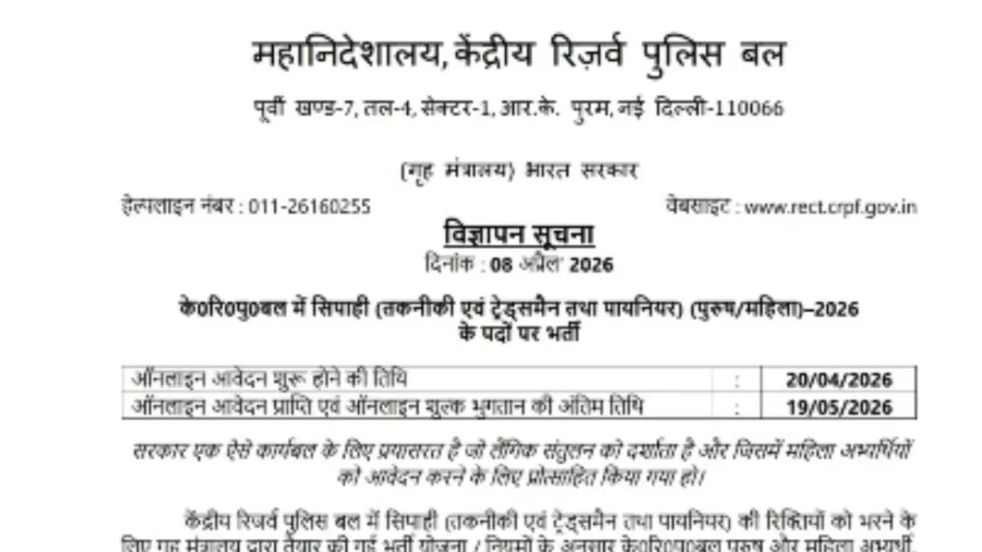 केंद्रीय रिजर्व पुलिस बल (CRPF) ने वर्ष 2026 के लिए कांस्टेबल भर्ती की आधिकारिक अधिसूचना जारी कर दी है। इस भर्ती अभियान के माध्यम से कुल 9,175 पदों को भरा जाएगा, जिसमें तकनीकी, ट्रेड्समैन और पायनियर श्रेणियां शामिल हैं। आधिकारिक जानकारी के अनुसार, आवेदन प्रक्रिया 20 अप्रैल 2026 से शुरू होगी। रक्षा क्षेत्र में करियर बनाने के इच्छुक उम्मीदवारों के लिए यह एक महत्वपूर्ण अवसर है, जिसके लिए ऑनलाइन आवेदन की अंतिम तिथि 19 मई 2026 निर्धारित की गई है।