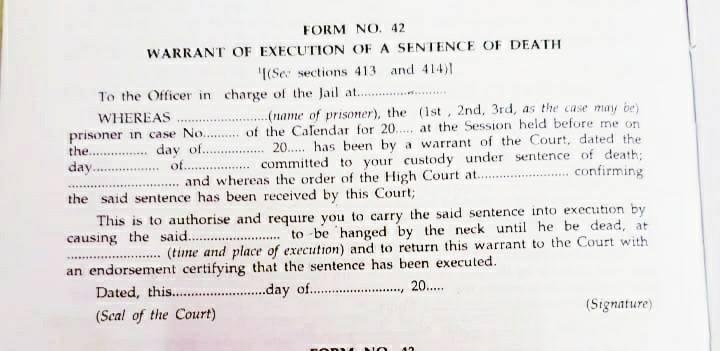 वकील राजीव मोहन की ओर से कहा गया कि ट्रायल कोर्ट की ओर से उन्हें दोषी करार दिया जा चुका है। आज की तारीख में कोई भी दया याचिका पेंडिंग नहीं है। इस दौरान एपी सिंह ने कहा कि उनके वकील पूरी रिपोर्ट कर रहे हैं, हमें भी इसकी कॉपी देनी चाहिए।दोषी अक्षय ने एक अखबार में छपी रिपोर्ट का हवाला दिया, जिसमें कहा गया कि निर्भया मामले का दोषी सजा टलवाने की साजिश रच रहा है। उसने कहा कि ये सभी झूठी रिपोर्ट्स हैं। इसमें कोई साजिश नहीं है।जो कानूनी कागजात फॉर्म नंबर 42 देख रहे हैं, यही होता है ब्लैक वॉरंट यानी डेथ वॉरंट। इसमें लिखा भी हुआ है वॉरंट ऑफ Execution Of A Sentence Of Death। पहले खाली कॉलम में जेल का नंबर लिखा होता है, जिस जेल में फांसी दी जाएगी। दूसरे कॉलम में फांसी पर चढ़ने वाले सभी दोषियों के नाम लिखे जाते हैं। खाली कॉलम में केस का FIR नंबर केस नंबर लिखा जाता है। उसके बाद के कॉलम में जिस दिन ब्लैक वॉरंट जारी हो रहा है, वो तारीख पहले लिखी जाती है, उसके बाद के कॉलम में फांसी देने वाले दिन यानी मौत के दिन की तारीख लिखी जाती है और किस जगह फांसी दी जाएगी वो लिखा जाता है, जिसके बाद अगले खाली कॉलम में फांसी पर चढ़ने वाले दोषियों के नाम के साथ बकायदा यह आगे फॉर्म में साफ-साफ लिखा है कि जिस-जिस को फांसी दी जा रही है, उनके गले में फांसी का फंदा जब तक लटकाया जाए जब तक उनकी मौत न हो जाए। फांसी होने के बाद मौत से जुड़े सर्टिफिकेट और फांसी हो गई है ये लिखित में वापस कोर्ट को जानकारी दी जाए, सबसे नीचे समय दिन और ब्लैक वॉरंट जारी करने वाले जज के साइन होते हैं। उसके बाद ये डेथ वॉरंट जेल प्रशासन के पास पहुंचता है, फिर जेल सुप्रीटेंडेंट समय तय करता है उसके बाद फांसी की जो प्रक्रिया जेल मैनुएल में तय होती है उस हिसाब से फांसी दी जाती है।