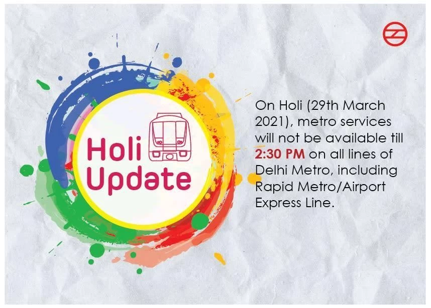दिल्ली मेट्रो रेल कॉरपोरेशन (DMRC) के मुताबिक, 29 मार्च को होली के त्योहार के दिन दिल्ली मेट्रो की एयरपोर्ट एक्सप्रेस लाइन समेत सभी लाइनों पर दोपहर 2:30 बजे तक मेट्रो की सेवाएं उपलब्ध नहीं होंगी।