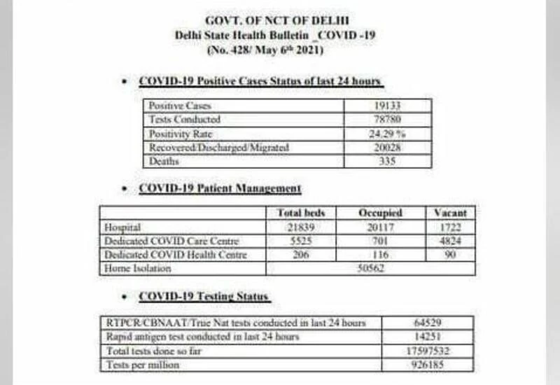नई दिल्ली: दिल्ली में कोरोना संक्रमण के मामलों में गुरुवार को मामूली गिरावट देखने को मिली, लेकिन कल की तुलना में आज मौत का आंकड़ा थोड़ा बढ़ गया है। दिल्ली में आज कोरोना के 19 हजार से अधिक नए पॉजिटिव केस सामने आए और 335 मरीजों की मौत हो गई। हालांकि, आज पॉजिटिविटी रेट में 2 फीसदी की कमी आने के बाद अब यह 24.29 फीसदी पर आ गया है।