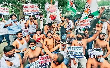 नई दिल्ली । कांग्रेस की युवा इकाई ने चुनिंदा रेल मार्गो पर ट्रेन चलाने के लिए निजी इकाइयों को अनुमति दिए जाने के फैसले के विरोध में शुक्रवार को यहां कमीज उतारकर (शर्टलेस) प्रदर्शन किया। भारतीय रेलवे के निजीकरण के खिलाफ सरकार द्वारा चुनिंदा मार्गो पर निजी ट्रेनों को चलाने के लिए निविदाएं आमंत्रित की गई थीं, जिसे लेकर युवा कांग्रेस ने प्रदर्शन किया।