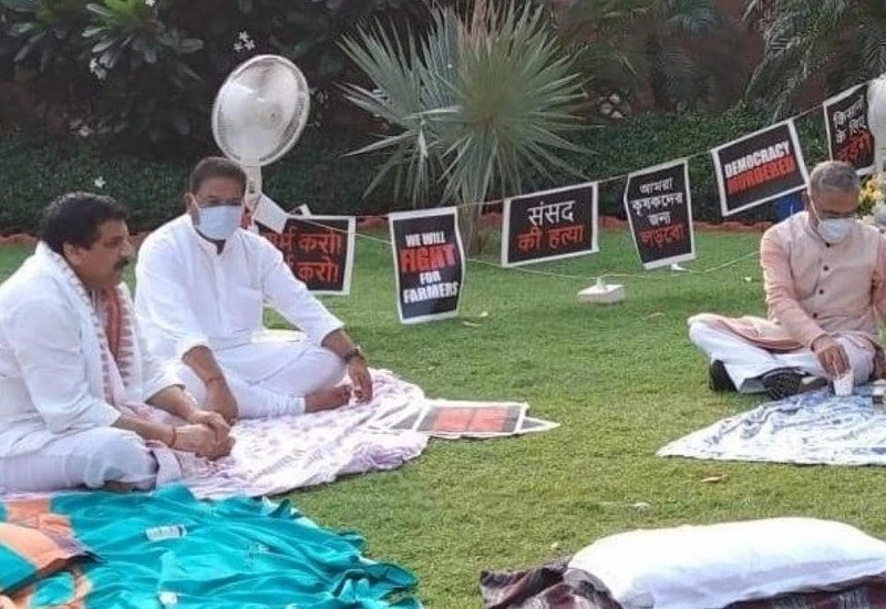रविवार को हुए हंगामे पर राज्यसभा के सभापति एम। वेंकैया नायडू ने सख्त एक्शन लेते हुए डेरेक ओ ब्रायन, संजय सिंह, राजीव साटव, केके रागेश, रिपुन बोरा, डोला सेन और ए करीम को पूरे सत्र के लिए सस्पेंड कर दिया गया। इसके बाद सभी निलंबित सांसद संसद परिसर में धरने पर बैठ गए हैं। धरना प्रदर्शन पूरी रात चला और सांसद, संसद परिसर में डटे हुए हैं।