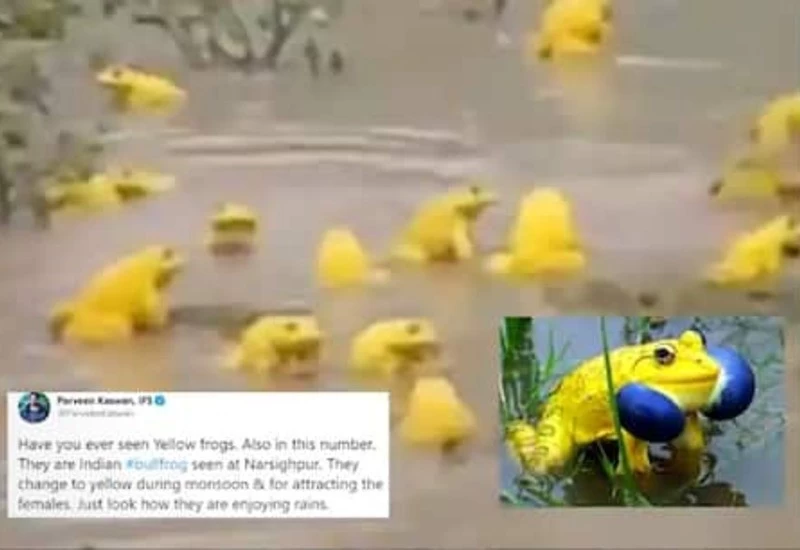 भारतीय वन सेवा (IFS) अधिकारी प्रवीण कसवान, उन लोगों में से एक हैं। जिन्होंने इन पीले मेंढकों का 30 सेकेंड का उछल-कूद मचाने का वीडियो (Video) ट्विटर पर शेयर किया है। वन अधिकारी (Forest Officer) ने बताया है कि जिस जगह पर इस वीडियो को फिल्माया गया है, वह नरसिंहपुर (Narsinghpur) है और मेंढकों का नाम इंडियन बुलफ्रॉग (Indian Bullfrog) है, जो मादाओं को आकर्षित करने के लिए अपना रंग बदल लेते हैं।