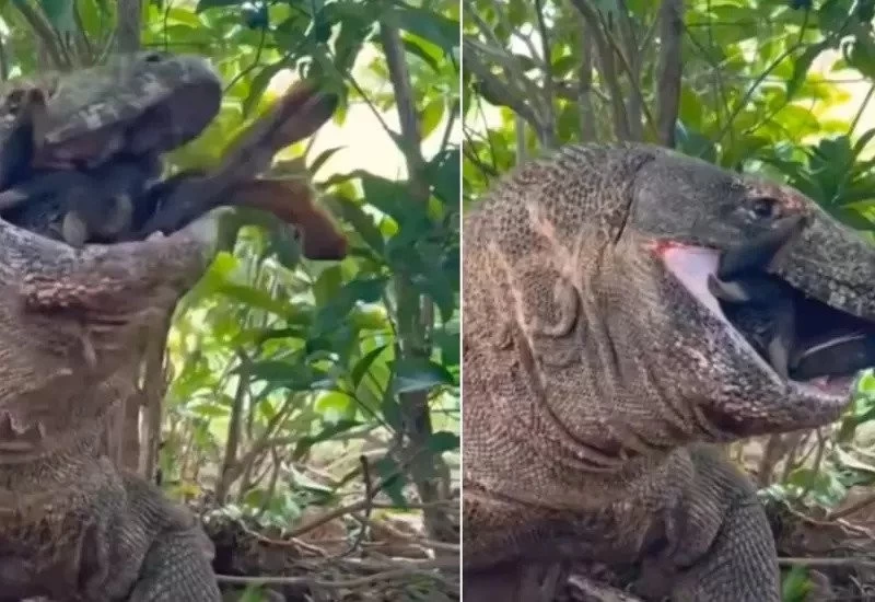 इस चौंकाने वाले वीडियो में देखा जा सकता है कि यह शातिर जीव कुछ ही सेकंड में एक बार में ही पूरी बकरी को निगल जाता है. जिस तरह से इसने बकरी को निगला, लोग पूरा वीडियो नहीं देख पा रहे हैं. सोशल मीडिया पर यह वीडियो कुछ ही सेकेंड में वायरल हो गया. कोमोडो ड्रैगन के छोटे जानवरों जैसे खरगोशों को निगलने के वीडियो काफी आम हैं, लेकिन एक पूरे बकरी को निगलने का यह वीडियो काफी अजीब है. क्लिप ने इंटरनेट को सोच में डाल दिया. नेटिजन्स ने कोमोडो ड्रैगन की पाचन क्षमताओं के बारे में चिंता दिखाते हुए कई सारे कमेंट्स किए, जिन्हें आप वीडियो को कमेंट सेक्शन में देख सकते हैं.
