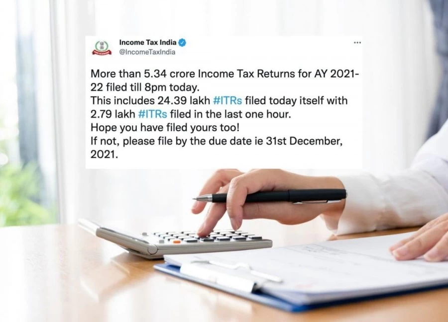 2021-22 Assessment Year के लिये इनकम टैक्स रिटर्न (आईटीआर) फाइलिंग की डेडलाइन 31 दिसंबर, 2021 को खत्म हो रही है. इनकम टैक्स विभाग के मुताबिक 29 दिसंबर तक 5.09 करोड़ टैक्सपेयर्स रिटर्न दाखिल कर चुके हैं. जिसमें केवल 29 दिसंबर को ही करीब 23.24 लाख टैक्सपेयर्स ने आयकर रिटर्न भरा है. इसलिए अपना आयकर रिटर्न जरुर 31 दिसंबर तक दाखिल कर लें. अगर आप शुक्रवार 31 दिसंबर तक आयकर रिटर्न भरते हैं तो आपको कोई चार्ज नहीं देना होगा.