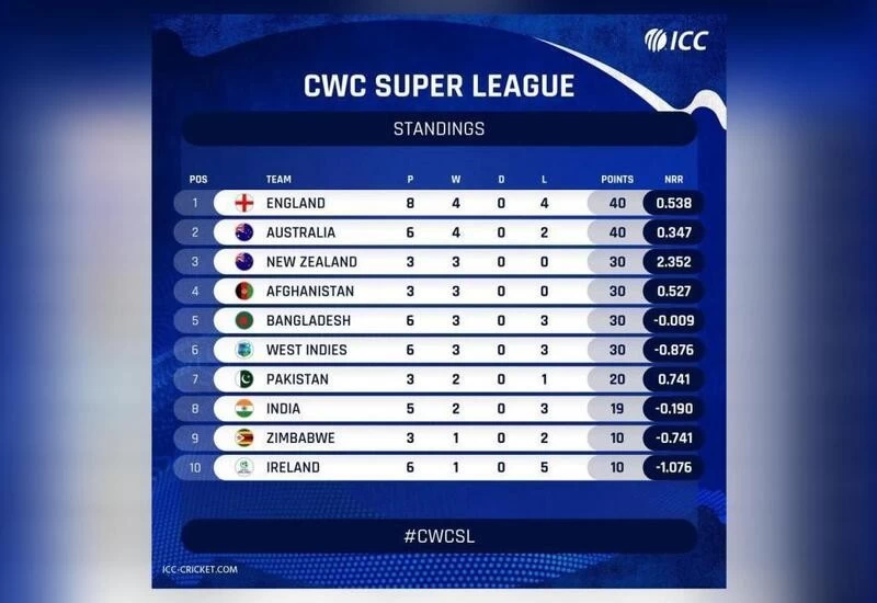 दूसरे वनडे में मिली जीत के बाद अब इंग्लैंड के ऑस्ट्रेलिया के बराबर 40 प्वॉइंट्स हो गए हैं, लेकिन बेहतर नेट रनरेट के चलते इंग्लैंड कंगारू टीम को पीछे छोड़ने में सफल रही है। इंग्लैंड और ऑस्ट्रेलिया के बाद तीसरे नंबर पर न्यूजीलैंड की टीम है, जिन्होंने हाल में ही बांग्लादेश को वनडे सीरीज में 3-0 से हराया है। चौथे नंबर पर अफगानिस्तान, पांचवें पर बांग्लादेश और वेस्टइंडीज की टीम छठे नंबर पर मौजूद है। भारत की टीम के 5 मैचों में 2 जीत के बाद कुल 19 प्वॉइंट हैं और टीम आठवें स्थान पर है।