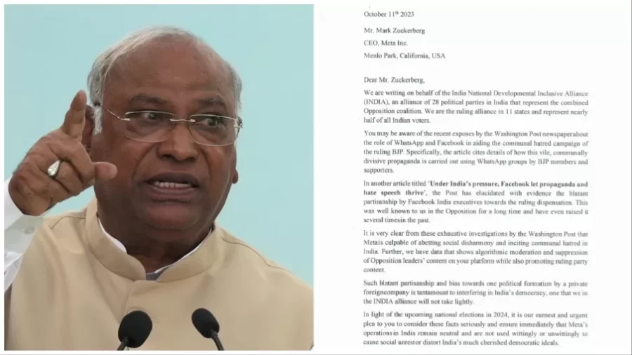 'INDIA' Alliance: विपक्षी गठबंधन I.N.D.I.A ने फेसबुक के संस्थापक मार्क जुकरबर्ग को एक चिट्ठी लिखा है। कांग्रेस पार्टी के राष्ट्रीय अध्यक्ष मल्लिकार्जुन खरगे ने इस चिट्ठी को सोशल मीडिया पर शेयर किया है। इस चिट्ठी में मीडिया रिपोर्ट्स का हवाला देते हुए कहा गया है कि मेटा भारत में सामाजिक असंगति को बढ़ावा देने और सांप्रदायिक नफरत को भड़काने का दोषी है। इस चिट्ठी में विपक्षी गठबंधन ने भाजपा पर भी आरोप मढ़ा है। इस खत में विपक्षी गठबंधन ने लिखा, 'I.N.D.I.A गठबंधन की तरफ से यह खत लिखा जा रहा है। I.N.D.I.A गठबंधन जो कि 28 राजनीतिक दलों का गठबंधन है, जो संयुक्त विपक्षी गठबंधन का प्रतिनिधित्व करता है। हम 11 राज्यों में सत्तारूढ गठबंधन हैं और सभी भारतीय मतदाताओं की लगभग आधी आबादी का प्रतिनिधित्व करते हैं।'