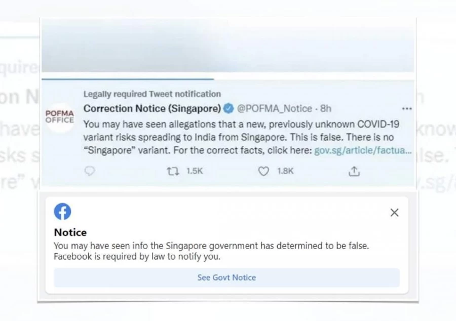 सिंगापुर के स्वास्थ्य मंत्रालय ने गुरुवार सुबह कहा कि यह देखने में आया है कि अलग-अलग ऑनलाइन मीडिया प्लेटफॉर्मों पर गलत बातें फैलाई जा रही हैं। इसमें सिंगापुर से कोरोना के नए वैरिएंट के फैलने की बात कही गई है। ऑनलाइन सोशल मीडिया प्लेटफॉर्मों पर यह भी कहा जा रहा है कि सिंगापुर में पैदा हुए कोरोना के इस नए वैरिएंट से भारत को खतरा है। स्वास्थ्य विभाग के मुताबिक स्वास्थ्य मंत्री ओंग ये कुंग ने पोफ्मा ऑफिस को इस बारे में सोशल मीडिया प्लेटफॉर्मों के लिए 'करेक्शन निर्देश' जारी करने के लिए कहा।