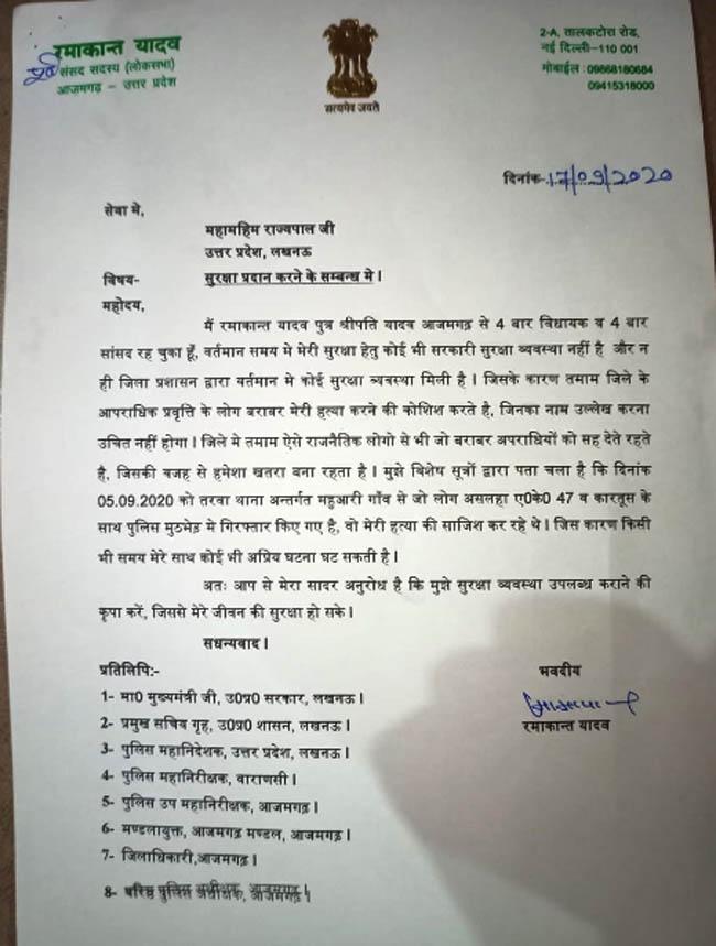 इसके साथ ही रमाकांत यादव ने अपनी चिट्ठी में 5 सितंबर को पुलिस मुठभेड़ में गिरफ्तार किए गए बदमाशों का भी जिक्र किया है। उन्होंने लिखा है कि मुझे विशेष सूत्रों से पता चला है कि तरवा थाना के महुआरी गांव से पुलिस मुठभेड़ में जो लोग गिरफ्तार किए गए हैं वो मेरी हत्या की साजिश कर रहे थे। जिस कारण किसी भी समय मेरे साथ कोई भी अप्रिय घटना घट सकती है। इसी के साथ उन्होंने राज्यपाल से अपने जीवन की सुरक्षा की गुहार लगाई है।