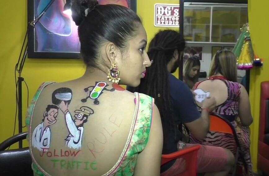 वहीं, कुछ महिलाएं देश में लागू हुए नए मोटर व्हीकल एक्ट (संशोधित) और प्लास्टिक बैन का टैटू बनवाकर जागरूकता का संदेश दे रही हैं.