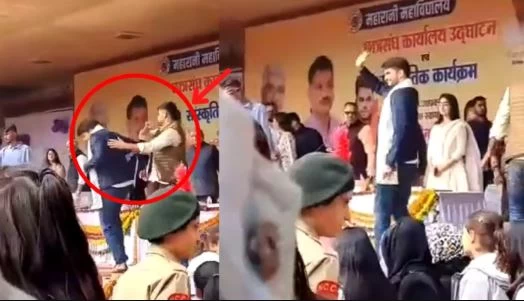 RU छात्रसंघ अध्यक्ष निर्मल चौधरी को महासचिव अरविंद जाजड़ा ने मंच पर जड़ा थप्पड़, देखें वीडियो#NirmalChoudhary #MaharaniCollege #RajasthanNews #BreakingNews #Jaipur pic.twitter.com/xA8QydTKHv