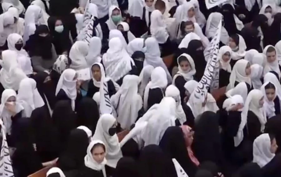 साझा किए गए वीडियो में कई लड़कियों को काले कपड़े और सफेद स्कार्फ में दिखाया गया है, कुछ को बुर्के पहने तालिबान के झंडे लहराते हुए देखा जा सकता है।