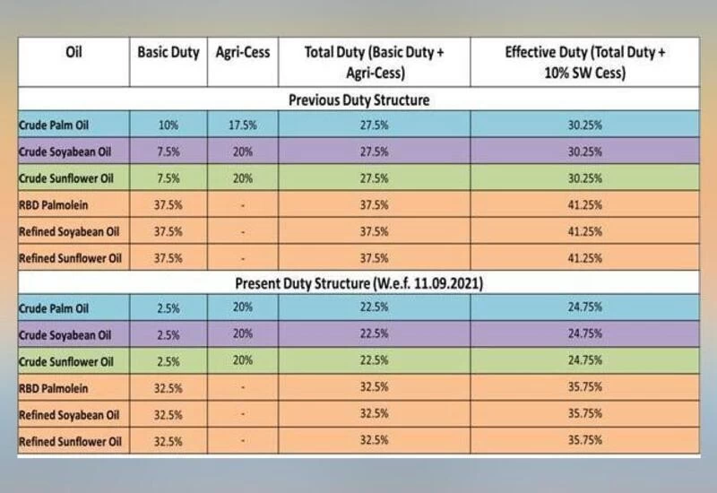सॉल्वेंट एक्सट्रैक्टर्स एसोसिएशन ऑफ इंडिया (एसईए) के कार्यकारी निदेशक बी.वी. मेहता ने पीटीआई-भाषा को बताया कि कर शुल्क में की गई इस कमी के साथ कच्चे पाम तेल, कच्चे सोया तेल और कच्चे सूरजमुखी तेल पर प्रभावी शुल्क घटकर 24.75 प्रतिशत रह जाएगा, जबकि रिफाइंड पाम तेल, सोया तेल और सूरजमुखी तेल पर प्रभावी शुल्क 35.75 प्रतिशत होगा।