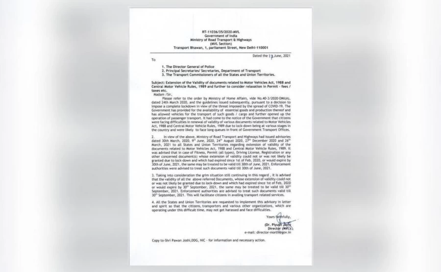 केंद्रीय सड़क एवं परिवहन मंत्रालय ने एक बयान में कहा कि केंद्रीय सड़क परिवहन और राजमार्ग मंत्रालय ने कोविड-19 के प्रकोप के मद्देनजर डीएल, आरसी, परमिट आदि वाहनों के दस्तावेजों की वैधता को 30 सितंबर, 2021 तक बढ़ा दिया है। इस संबंध में मंत्रालय ने आज राज्यों और संघ शासित प्रदेशों को एक परामर्श जारी किया। इससे पहले विभिन्न अधिसूचनाओं के माध्यम से यह सलाह दी गई थी कि फिटनेस की वैधता, परमिट (सभी प्रकार), लाइसेंस, पंजीकरण या किसी अन्य संबंधित दस्तावेजों को 31 मार्च, 2021 तक वैध माना जा सकता है।