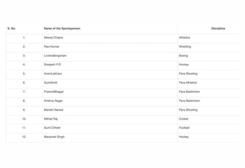 नीरज चोपड़ा (एथलेटिक्स), रवि कुमार (कुश्ती), लवलीना बोरगोहेन (मुक्केबाजी), पीआर श्रीजेश (हॉकी), अवनि लेखारा (पैरा शूटिंग), सुमित अंतिल (पैरा एथलेटिक्स), प्रमोद भगत (पैरा बैडमिंटन), कृष्णा नागर (पैरा बैडमिंटन), मनीष नरवाल (पैरा शूटिंग), मिताली राज (क्रिकेट), सुनील छेत्री (फुटबॉल), मनप्रीत सिंह (हॉकी).