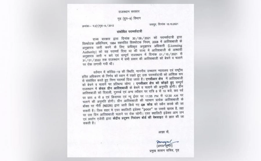 राजस्थान सरकार की तरफ से जारी संशोधित गाइडलाइंस के अनुसार, NCR यानी राष्ट्रीय राजधानी क्षेत्र को छोड़कर पूरे राज्य में ग्रीन पटाखों की बिक्री और फोड़ने की इजाजत होगी.