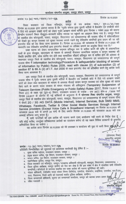 जयपुर. 1 नवंबर को प्रस्तावित गुर्जर आंदोलन (Gujjar Reservation Movement:) के मद्देनजर राजस्थान में प्रशासन अलर्ट के मोड़ पर आ गया है. जयपुर संभागीय आयुक्त सोमनाथ मिश्रा ने शुक्रवार को एक अहम आदेश जारी कर जयपुर जिले की कोटपूतली पावटा शाहपुरा विराटनगर जमवारामगढ़ तहसील में 24 घंटे के लिए इंटरनेट बंद रखने के आदेश जारी कर दिए हैं. संभागीय आयुक्त द्वारा जारी आदेश के अनुसार 30 अक्टूबर शाम 6:00 से 31 अक्टूबर शाम 6:00 बजे तक इंटरनेट सेवाएं बंद रहेंगी. गुर्जर बाहुल्य इलाकों में विशेष चौकसी बरतने के भी निर्देश दिए गए हैं. इससे पहले संभागीय आयुक्त ने भरतपुर और करौली में इंटरनेट सेवाएं बंद रखने के आदेश जारी किए थे.