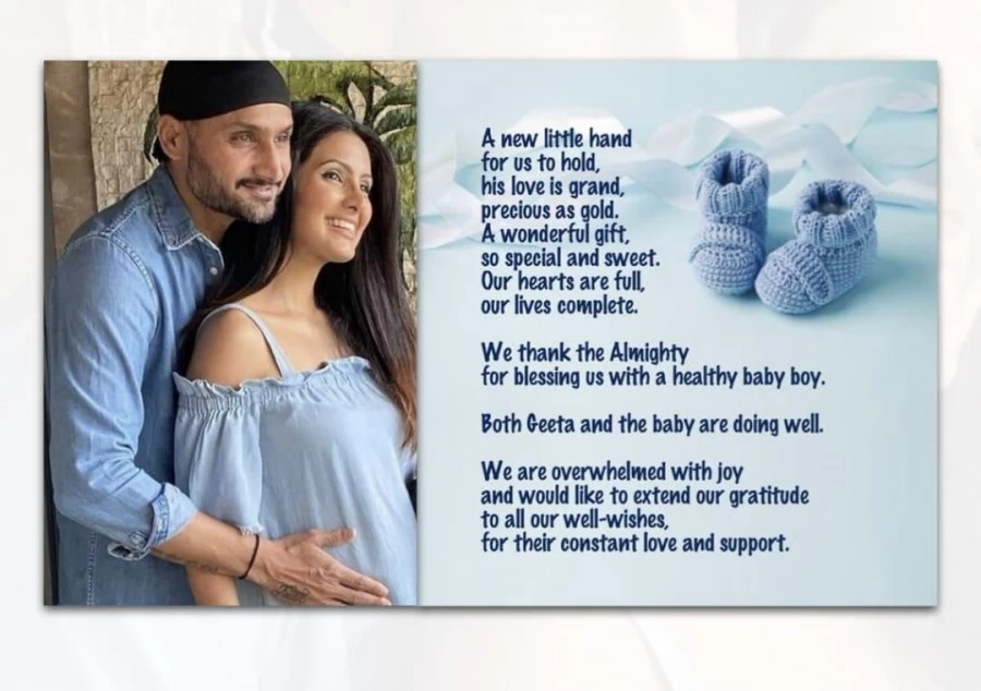 हरभजन सिंह ने बताया कि उनकी पत्नी और बेटा दोनों स्वस्थ है. मार्च में इस कपल ने बताया था कि वह जुलाई में उनके घर नन्हा मेहमान आने वाला है. भारतीय सलामी बल्लेबाज शिखर धवन सहित कई क्रिकेटर्स ने हरभजन को दूसरी बार पिता बनने पर बधाई दी है.