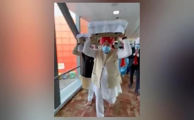 #WATCH | Union Minister Hardeep Singh Puri brings three swaroops of Sri Guru Granth Sahib out of the Delhi airport.
