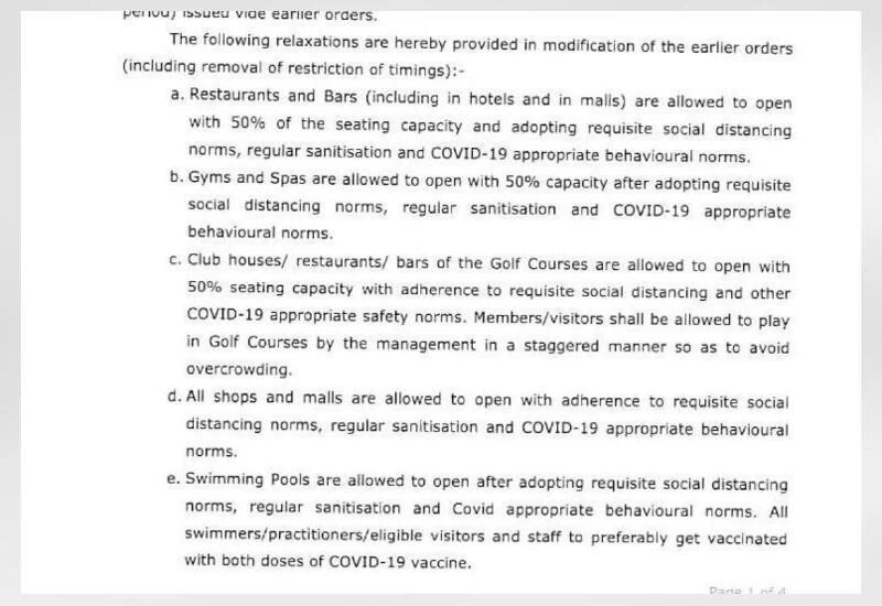 इसमें कहा गया है कि राज्य में मॉल स्थित रेस्टोरेंट, बार, होटल, मॉल्स, जिम, स्पा सेंटर, क्लब हाउस, गोल्फ कोर्स के बार को सोशल डिस्टेंसिंग और कोरोना गाइडलाइन का पालन करते हुए 50 प्रतिशत क्षमता के साथ खोला जा सकता है. इसके अलावा स्विमिंग पूल को भी कोरोना गाइडलाइन का सख्ती से पालन करते हुए दोबारा खोलने की अनुमति सरकार ने दे दी है. होटलों, रेस्टोरेंट और फास्ट फूड प्रतिष्ठानों से होम डिलीवरी को रात 11 बजे तक अनुमति है. इस बीच, दुकानों, मॉल, रेस्तराओं, धार्मिक स्थलों, कॉरपोरेट कार्यालयों के खुलने संबंधी लॉकडाउन संबंधी ढील वर्तमान की तरह जारी रहेगी.