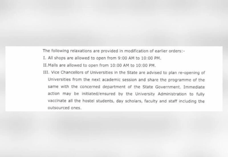 आदेश के मुताबिक महिला और बाल विकास विभाग द्वारा संचालित आंगनवाड़ी केंद्र और क्रेच राज्य में 15 अगस्त तक बंद रहेंगे. आदेश में आगे कहा गया कि विश्वविद्यालयों के कुलपतियों को सलाह दी जाती है कि वे अगले शैक्षणिक सत्र से विश्वविद्यालयों को फिर से खोलने की योजना बनाएं और इस बारे में कार्यक्रम को राज्य सरकार के संबंधित विभागों के साथ साझा करें.