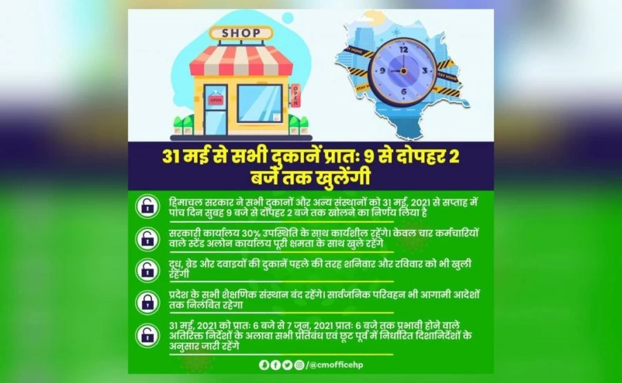 दरअसल, हिमाचल प्रदेश की सरकार ने 31 मई से हफ्ते में पांच दिन पांच घंटे सभी दुकानें और अन्य संस्थानों को खोलने की इजाजत दे दी है। हिमाचल सरकार ने निर्णय लिया है कि, ''आगामी 31 मई से राज्य में सभी दुकानों और अन्य संस्थानों को सप्ताह में पांच दिन सुबह 9 से दोपहर 2 बजे तक खोला जाएगा। सरकार ने सरकारी कार्यालयों सहित शैक्षणिक संस्थान और सार्वजनिक परिवहन को लेकर भी फैसला किया है।''