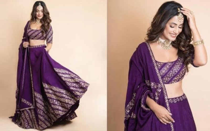 बॉलीवुड | हिना खान अपने स्टाइलिश अंदाज के लिए जानी जाती हैं। अपने ट्रेडिंग आउटफिट्स और फोटोशूट की बदौलत उनका नाम स्टाइलिश सेलिब्रिटीज की लिस्ट में सबसे ऊपर आता है। हाल ही में हिना ने पर्पल लहंगा-चोली पहनकर फोटोशूट कराया है। ये दिलकश फोटोज फैन्स को बेहद पसंद आ रही हैं। इन फोटोज में हिना ने कई तरह के पोज देकर अपने स्टाइलिश ट्रेडिशनल आउटफिट को फ्लॉन्ट किया है।