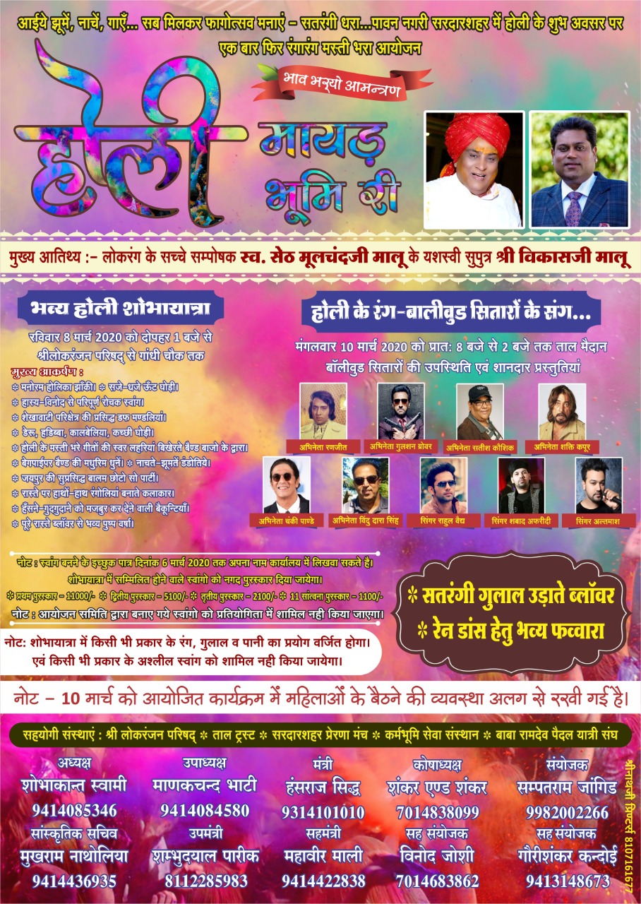 सरदारशहर: होली के अवसर पर 8 से 10 मार्च तक चलने वाले कार्यक्रम 'होली मायड़ री' में बॉलीवुड के तमाम बड़े अभिनेता शामिल होंगे। कार्यक्रम में मुख्य अतिथि के तौर पर विकास जी मालू शामिल होंगे। कार्यक्रम की शुरुआत 8 मार्च को भव्य होली शोभायात्रा के साथ की जायेगी। शोभायात्रा में होली की मनोरम झाकियां भी निकाली जायेगी। कार्यक्रम में अभिनेता शक्ति कपूर, गुलशन ग्रोवर, चंकी पांडे, सतीश कौशिक जैसी कई बड़ी हस्तियां शामिल होंगी।शोभायात्रा 8 मार्च को दोपहर 1 बजे लोकरंजन परिषद से गाँधी चौक तक निकाली जायेगी। बॉलीवुड सितारे मंगलवार 10 मार्च को प्रातः 8 बजे से 2 बजे तक शानदार प्रस्तुतिया देंगे।