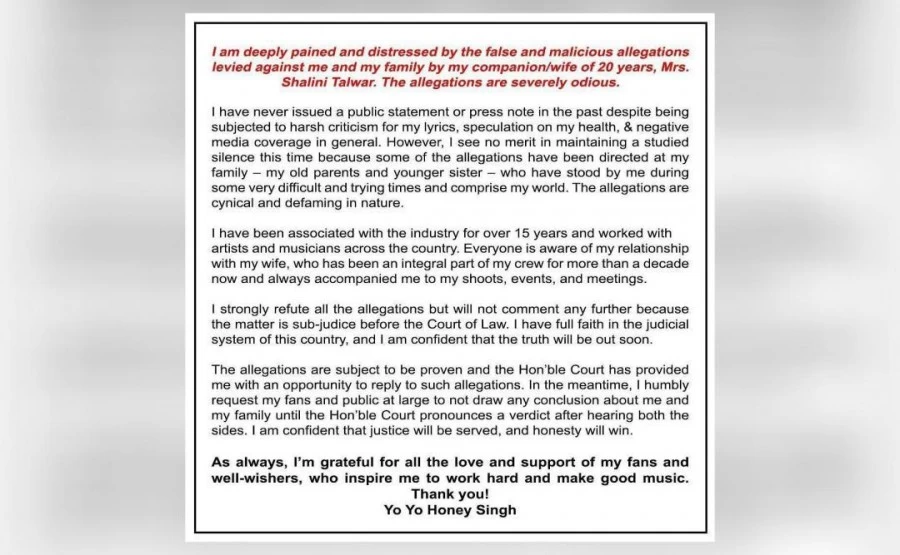 हनी सिंह (Honey Singh) ने आगे लिखा, 'मैं इस इंडस्ट्री में पिछले 15 सालों से जुड़ा हुआ हूं. इस इंडस्ट्री से जुड़े कई आर्टिस्ट, मूजिशियन मेरे खास दोस्त हैं. इन सभी को पता है कि मेरा रिश्ता पत्नी संग कैसा रहा है. मैं शालिनी द्वारा लगाए सभी आरोपों को बेबुनियाद करार करता हूं. अब इस मामले पर इससे ज्यादा मैं और कुछ नहीं कहूंगा. मामला कोर्ट में है और मुझे कानून पर पूरी तरह विशवास है. सच जल्द लोगों के सामने आएगा.'