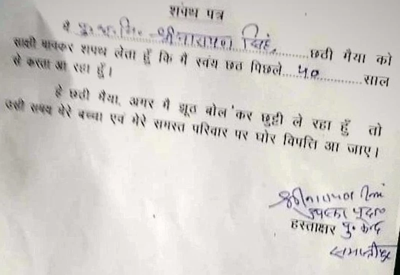 मैं ............. छठी मैया को साक्षी मानकर शपथ लेता हूं कि मैं स्वंय छठ पिछले ........... साल से करता आ रहा हूं। हे छठी मैया, अगर मैं झूठ बोल कर छुट्टी ले रहा हूं, तो उसी समय मेरे बच्चे और मेरे पूरे परिवार पर घोर विपत्ति आ जाए।