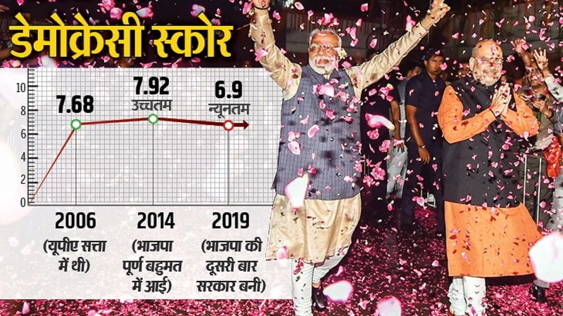 द इकोनॉमिस्ट ने 2006 में डेमोक्रेसी इंडेक्स जारी करना शुरू किया था। तब से अब तक 13 साल में यह भारत का सबसे कम डेमोक्रेसी स्कोर है। 2014 में यह सबसे ज्यादा 7.92 था। डेमोक्रेसी इंडेक्स चुनावी प्रक्रिया और अनेकता की स्थिति, सरकार की कार्यप्रणाली, राजनीतिक भागीदार, राजनीतिक संस्कृति और सामाजिक स्वतंत्रता जैसे 5 बिंदुओं के आधार पर जारी की जाती है।