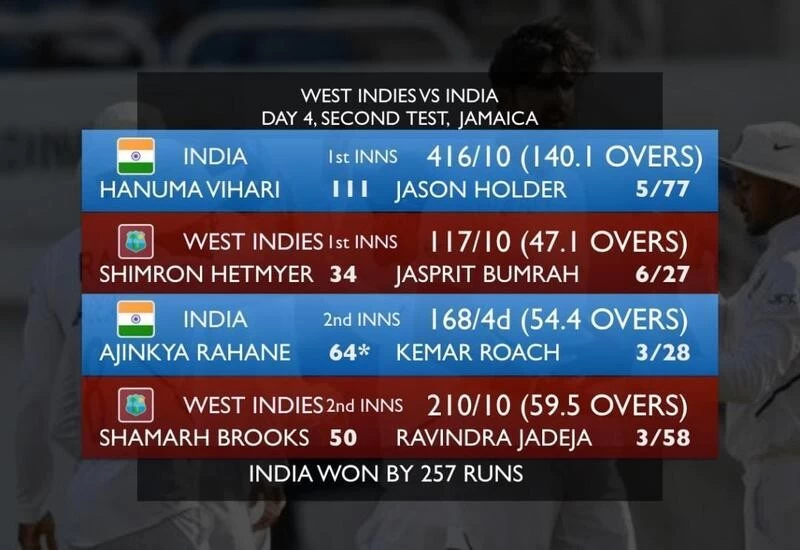 जमैका. भारत ने वेस्टइंडीज को दूसरे टेस्ट में 257 रन से हरा दिया। इसी के साथ टीम इंडिया ने वेस्टइंडीज से टेस्ट सीरीज 2-0 से जीत ली। यह पहली बार है जब भारत ने विंडीज टीम को लगातार चार टेस्ट मैच हराए। इससे पहले 2013 से 2016 के बीच टीम इंडिया ने विंडीज को लगातार तीन टेस्ट हराए थे। वेस्टइंडीज के खिलाफ भारत की यह लगातार आठवीं टेस्ट सीरीज जीत है। 2002 के बाद से ही टीम इंडिया के खिलाफ वेस्टइंडीज टेस्ट सीरीज जीतने में सफल नहीं हुआ है।