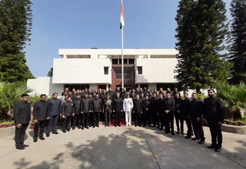 भारतीय उच्चायोग ने अपने कर्मचारियों की तस्वीरों को पोस्ट किया। 50 पुरुषों को बंद-गले के काले सूट में देखा जा सकता है। उनके साथ नौ महिलाएं साड़ी पहने कुछ बच्चों के साथ खड़ी हैं। सभी ने हाथ पकड़े हैं और कुछ ने विक्ट्री का साइन (विजय चिन्ह) बनाया है।