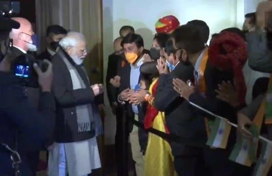 ग्लासगो: प्रधानमंत्री नरेंद्र मोदी रविवार (स्थानीय समय) को जैसे ग्लासगो के एक होटल में पहुंचे तो वहां उनका 'मोदी है भारत का गहना' के नारों के साथ भव्य स्वागत किया गया। पीएम मोदी यहां COP-26 कॉन्फ्रेंस के महत्वपूर्ण 26वें सत्र में भाग लेने के लिए दो दिवसीय यात्रा पर पहुंचे हैं। पीएम मोदी ने होटल में मौजूद भारतीय समुदाय के एक बच्चे से भी बातचीत के अलावा लोगों से मुलाकात भी की।