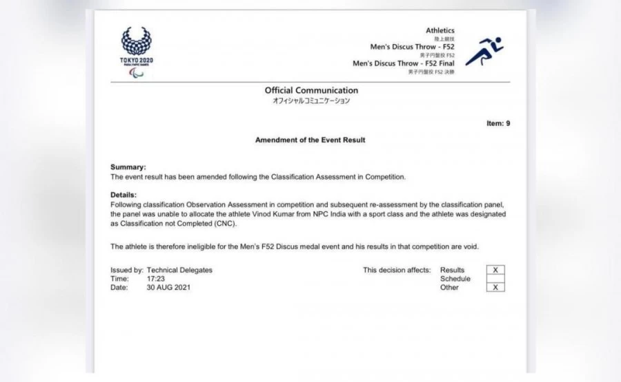 आयोजकों ने एक बयान में कहा, ‘‘पैनल ने पाया कि एनपीसी (राष्ट्रीय पैरालंपिक समिति) भारत के एथलीट विनोद कुमार को ‘स्पोर्ट क्लास’ आवंटित नहीं कर पाया और खिलाड़ी को ‘क्लासिफिकेशन पूरा नहीं किया’ (सीएनसी) चिन्हित किया गया। ’’