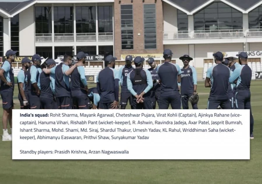 भारतीय टेस्ट स्क्वायडः रोहित शर्मा, मयंक अग्रवाल, चेतेश्वर पुजारा, विराट कोहली (कप्तान), अजिंक्य रहाणे, हनुमा विहारी, ऋषभ पंत, आर अश्विन, रविंद्र जडेजा, अक्षर पटेल, जसप्रीत बुमराह, ईशांत शर्मा, मोहम्मद शमी, मोहम्मद सिराज, शार्दुल ठाकुर, उमेश यादव, केएल राहुल, ऋद्धिमान साहा, अभिमन्यु ईश्वरन, पृथ्वी शॉ, सूर्यकुमार यादव।