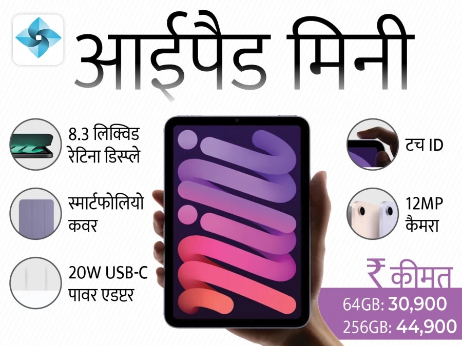 आईपैड मिनी में टॉप बटन पर टच ID है और इसमें स्लिम और यूनिफॉर्म बेजल के साथ 8.3-इंच का ऑल-स्क्रीन डिस्प्ले दिया है। आईपैड मिनी में ट्रू टोन फ्लैश के साथ 12MP का रियर कैमरा है। इससे 4K वीडियो रिकॉर्डिंग भी कर पाएंगे। फ्रंट में 12.2MP का अल्ट्रा-वाइड कैमरा मिलता है। इसमें स्टीरियो ऑडियो सपोर्ट भी मिलता है। कनेक्टिविटी के लिए इसमें Wi-Fi 6, ब्लूटूथ, USB-C और 5G कनेक्टिविटी मिलती है। इसके 64GB वैरिएंट की कीमत 30,900 रुपए और 256GB वैरिएंट की कीमत 44,900 रुपए है।